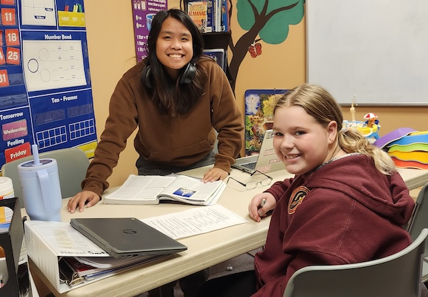 Sophia Standish, standing, is working with Abigail Smith, a new student at the Orleans County Christian School.