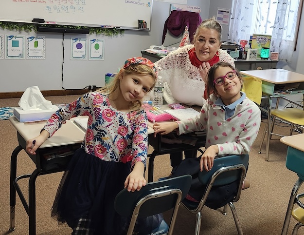 Photos by Ginny Kropf: Krista Lawson, standing, teaches all subjects to first-, second- and third-graders, in addition to teaching Bible and acting as school nurse at Orleans County Christian School. Two of her students are Zavina Wright, 7, and Isabella DeVore, 6. Lawson is the wife of Kevin Lawson, pastor of The Vine Church on Maple Ridge Road.