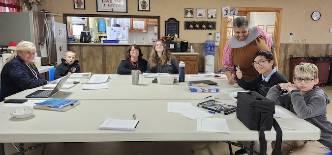 Students and teachers frequently gather in the Community Room at Orleans County Christian School. Here, from left, are Mary Hollenbeck, an all-around teacher, GED instructor or adviser on hybrid or distance learning; Dawn Zaidel, principal and English and history teacher; a 10th grade hybrid student; Ayesha Kreutz (standing), newly hired administrator; and students Levi, 13, and Jayden 11.