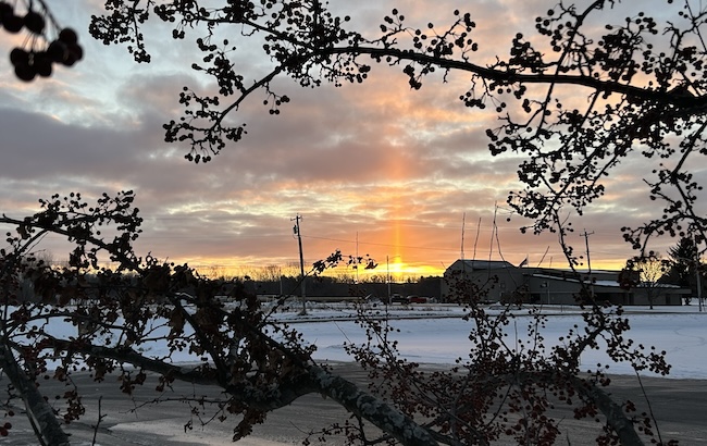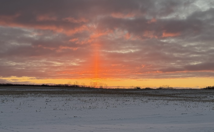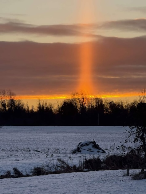 This morning’s sun rise included a sun pillar, a stunning optical phenomenon that appears as a vertical shaft of light extending up from the sun.