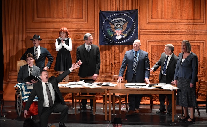 Albion teacher Mr. Rich Gannon, lower left, really poured himself into the role of Harold Ickes. Bradyn Whitter, a senior, portrayed Franklin Delano Roosevelt. Other Cabinet members include, going left from Annie and Warbucks, Mr. Josh Green as Henry Morganthau, Mr. Bill Dambra as Cordell Hull, Mr. Chad Owen as Louis Howe, and Mrs. Jennifer Ashbery as Frances Perkins.