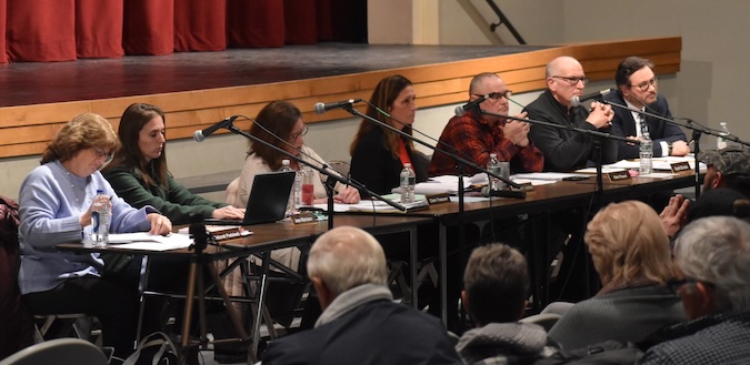 Photos by Tom Rivers: The Medina Village Board moved its meeting on Thursday evening to the high school auditorium due to a larger crowd expected as the board tries to determine whether it will put a new ladder truck into service and put an addition on the fire hall for the new truck. From left include Village Trustee Debbie Padoleski, Trustee Jess Marciano, Clerk/Treasurer Jada Burgess, Mayor Marguerite Sherman, Trustee Mark Prawel, Trustee Scott Bieliski and Village Attorney Matt Brooks.