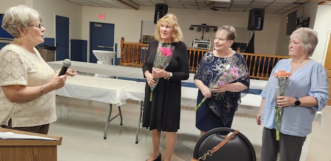Elaine Watts, left, president of the Shelby Ladies’ Auxiliary, presented flowers to dedicated members Lori Myhill, Robyn Watts and Marian Fry.