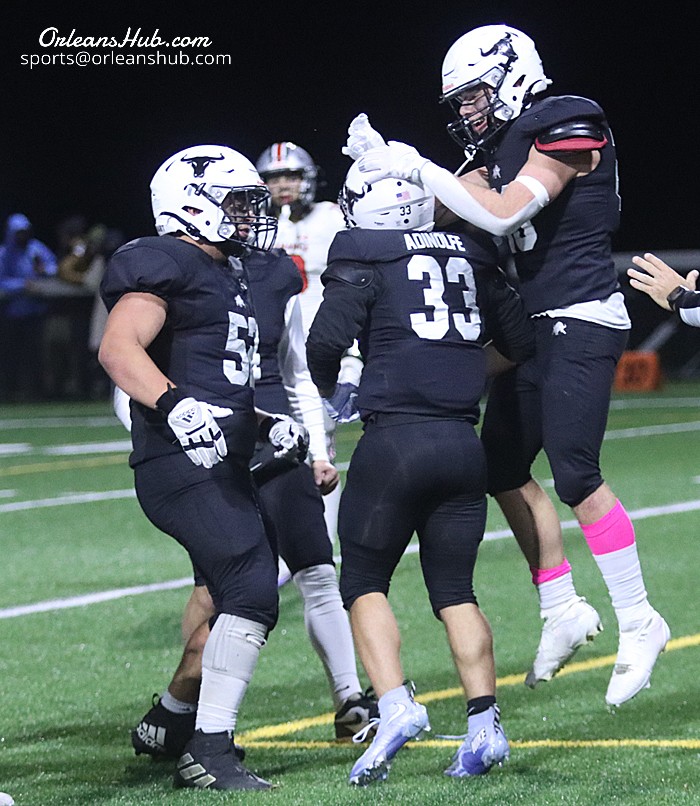 Photos by Cheryl Wertman – RJ Townsend (52) and Vince Fazzio (26) celebrate with Anthony Adinolfe after his touchdown catch which put the Bulls on top to stay just before halftime.