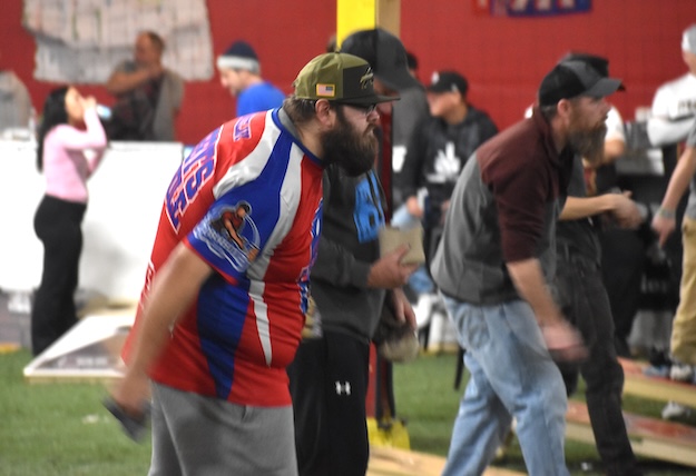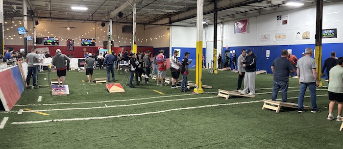 Photos by Tom Rivers: Some of the cornhole take warmup tosses before a game on Saturday. Each team played four rounds before going into a double-elimination playoff. There were some pro players from Canada and also the American Cornhole League among the participants in the tourney.