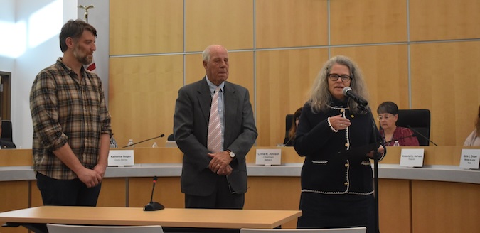 ALBION – Kristina Gabalski accepts a “Special Recognition Award” from the Orleans County Legislature on Tuesday. She was presented the award from County Legislator Ed Morgan. Robert Batt, executive director of the Cornell Cooperative Extension, is at left.