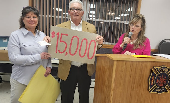 East Shelby Fire Chief Deb Taylor, left, and president Mike Fuller accept $15,000 from the East Shelby Ladies Auxiliary president Bronwyn Green.