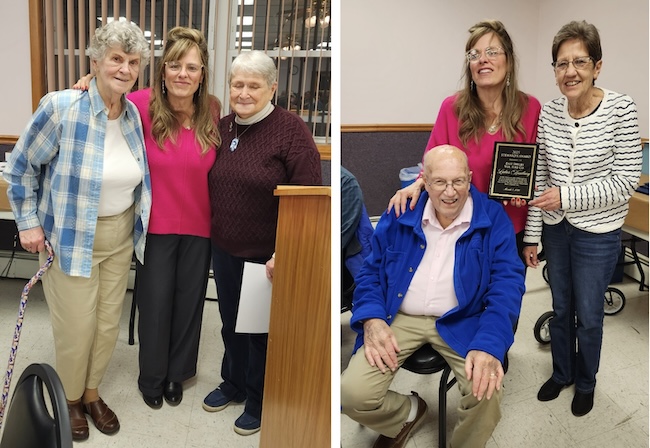 (Left) Bronwyn Green, center, poses with Doris Antinore, left, and Gerry Zinkievich, both of whom were recognized for 55 years of membership in the East Shelby Ladies Auxiliary. (Right) Dave Green, who was served East Shelby Volunteer Fire Company as steward for 41-1/2 years, chose the Ladies’ Auxiliary as recipient of the Steward’s Award. Accepting the award are Auxiliary president Bronwyn Green and vice president Leona Weese.