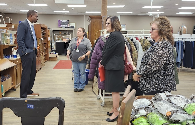 Photos by Ginny Kropf: Lt. Governor Antonio Delgado gets a tour of Community Action’s Main Street Corner Thrifts, Gifts and More store during his visit on Tuesday. Here, he talks with Cassie Healy, manager of the store; Renee Hungerford, Community Action’s chief executive officer; and Jackie Dunham, chief operating officer.