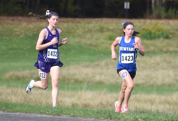 Eden Hillman, right, of Newfane is out in front in today’s girls race. She defended her title, winning the race in 19:36.61, with Taylor Alvord of Roy-Hart in second. Hillman won the race as a seventh-grader a year ago in 21:41. She lowered her time by more than two minutes in winning today’s title.