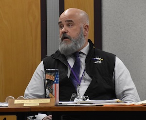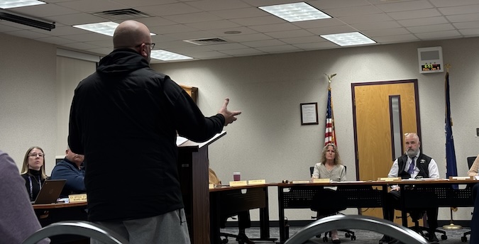 Photos by Tom Rivers: Geno Allport speaks during this evening’s Albion Board of Education meeting, stating his support for an Albion/Medina merged football program. Linda Weller, the board president, and Mickey Edwards, the district superintendent, are shown leading the meeting.