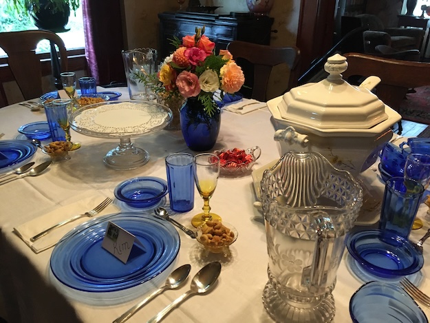 Photo courtesy of Cobblestone Museum: The Cobblestone Museum will present a virtual Zoom event about Depression Era glass April 9. Here, a table is set with Depression Era glass for a luncheon at the Vagg House. The blue pieces are Moderntone Cobalt Depression glass. The Zoom program will begin at 7 p.m.