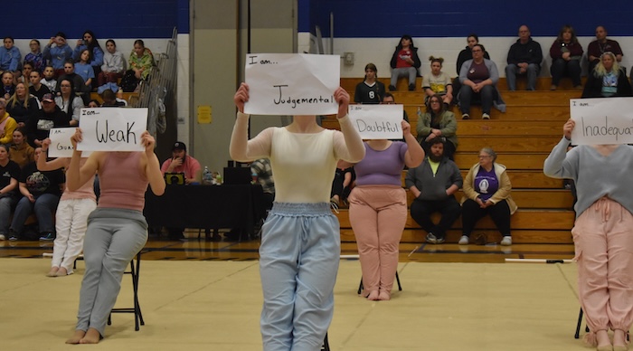 The Marcus Whitman Marching Wildcat Varsity Winterguard presented “Mine.” The show asks people to reflect on life’s everyday challenges and demonstrates how witnessing the resilience of others shapes the way we face our own obstacles. At the end of the performance the members each ripped up the paper with the obstacle they were facing.