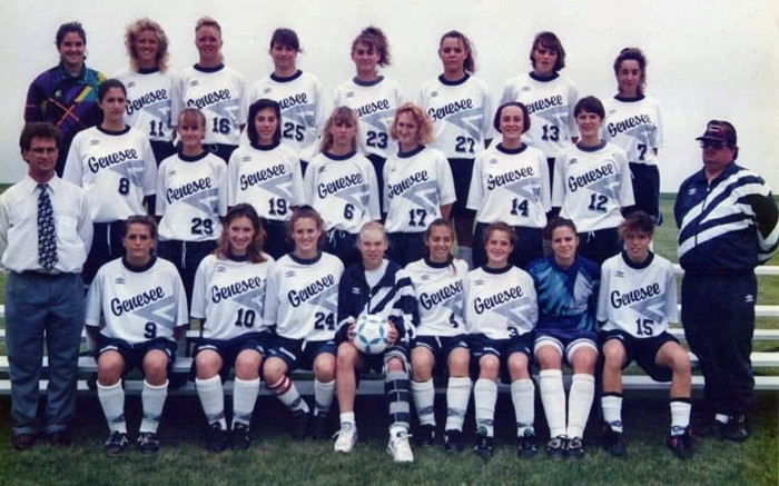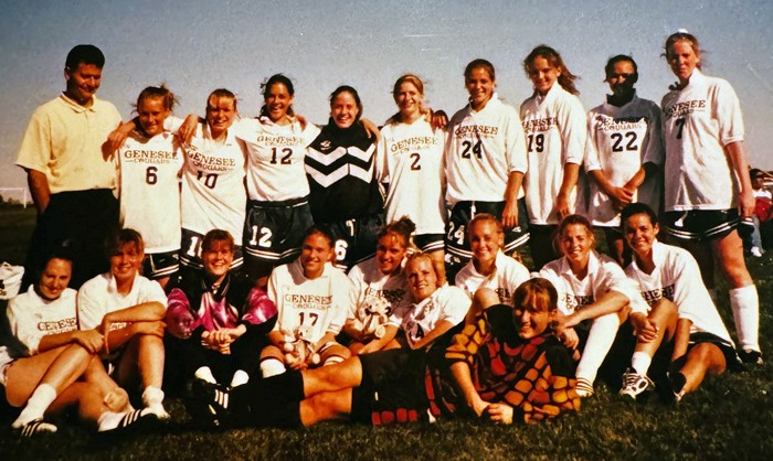 Contributed Photos – The 1995-96 Genesee Community College women’s soccer team included Jeanette Brady, No. 3 third from right in front row, who is the mother of current GCC sophomore Emma Brady.