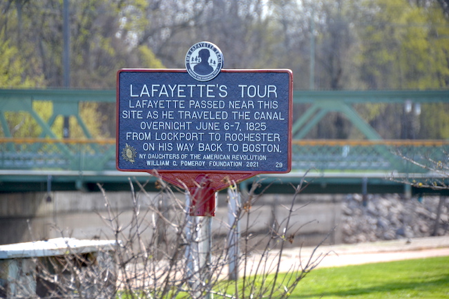Photos by Tom Rivers: This historical marker dedicated for a Revolutionary War hero was unveiled on April 14, 2021. The marker highlights Marquis de Lafayette, a French military officer who provided critical aid to George Washington in securing American independence. The marker notes a farewell tour in 1824-1825 to honor Lafayette, who traveled on the Erie Canal from Lockport to Rochester in June 1825 to great fanfare. This marker is located by the Erie Canal in Albion in between the two lift bridges.