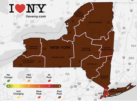Map from I Love New York: While nearly all of the state is past peak, there are still vibrant colors on the trees in New York City.