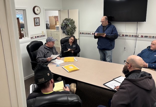 Jason Watts, superintendent of the Medina Department of Public Works, opens bids from four contractors this afternoon. Miranda Herbert, the village’s deputy clerk, records the bid amounts.