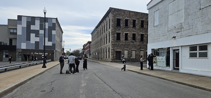 Crew members getting ready to shoot a scene inside the Pratt Theater on Saturday. The crew arrived in Albion about 2 a.m. Saturday and will be busy making the film this weekend.