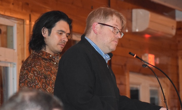 Andrew Meier, right, and his partner Richie Sarrero accept the Phoenix Award for their efforts to restore and repurpose the Newell building at 113 West Center St.