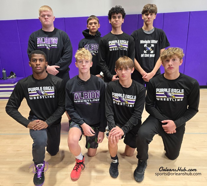 Photo by Cheryl Wertman – The Albion wrestling squad’s veteran group includes, in front, Jaxon Lynch, Drake Schomske, Justin Mengs and Alakai Colmenero. In back are Jackson Snook, Stryker Sanders, Kaiser Allport and Corbin Piccirilli.