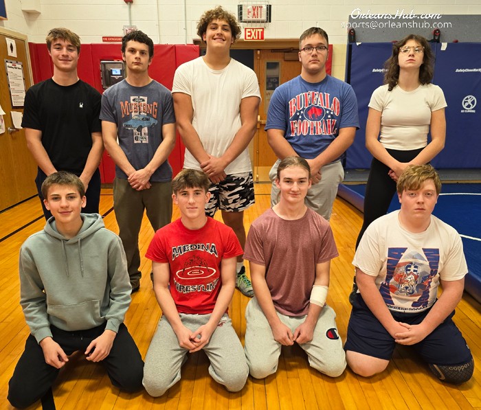 Photo by Cheryl Wertman – Veteran members of the Medina wrestling team include, in front, Jacob Duffina, Luke Duffina, Ryan Frentz and Cole Herman. In back are Tyler Raduns, Nolan Stanton, Frankie Stephens, Nate Surdel and Britten Brady.