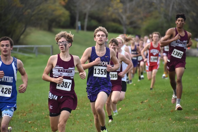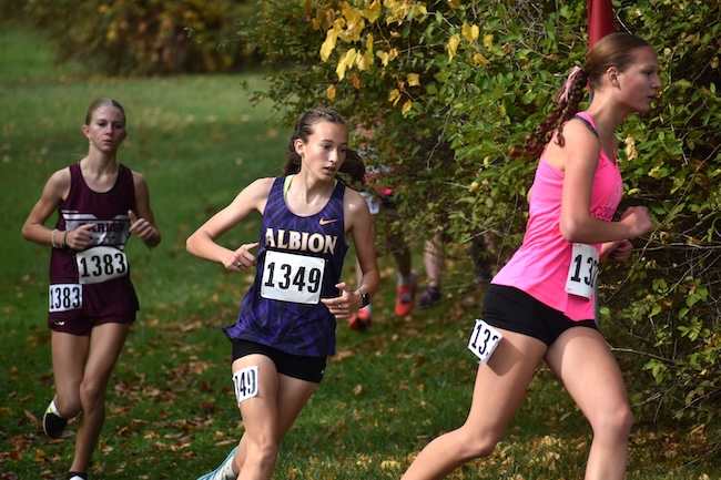 This group keeps up a fast pace during the first part of the race. In front are Hannah Monaco of Barker and Rachel Herbert of Medina. Right behind them are Lorelei Gailie of Albion and Aubrey Burning of Albion.