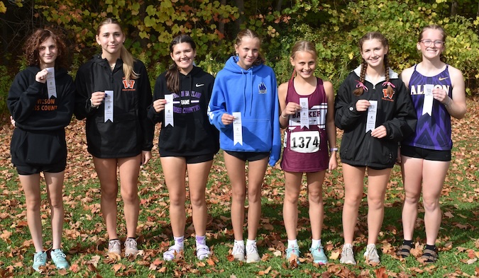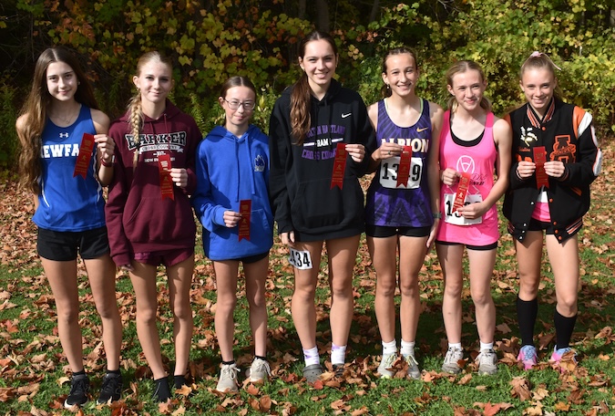 Honorable Mention: Pictured from left include Mikaila Akers of Wilson, 15th in 23:21; Hayden Barlow of Wilson, 16th in 23:25; Samantha Silsby of Roy-Hart, 17th in 23:46; Sienna Gibson of Newfane, 18th in 24:10; Hannah Monaco of Barker, 19th in 24:38; Madelyn Freatman of Wilson, 20th in 24:56; and Lorelei Gailie of Albion, 21st in 25:13.