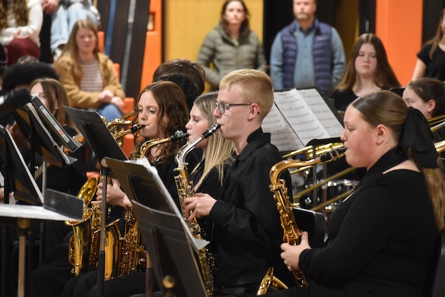 LYNDONVILLE – These saxophone players from Albion – left to right include Isla DeBoard, Kailee Anstey, Carter Krull and Phoebe Allen – perform during Friday’s night Jazz Coffee House in the Lyndonville gym.