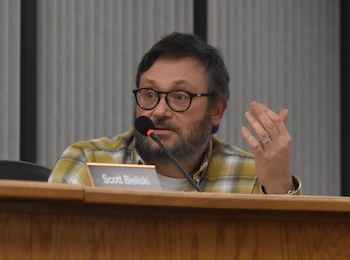 Photos by Tom Rivers: Eric Valley, Medina’s athletic director and head football coach, shares his reasons for supporting a merger with Albion for football at the modified, junior varsity and varsity levels. Next to him, from right to left, are Board of Education members Donnell Holloway, Jennifer Buondonno, Kristin Grose and Annette Allis.