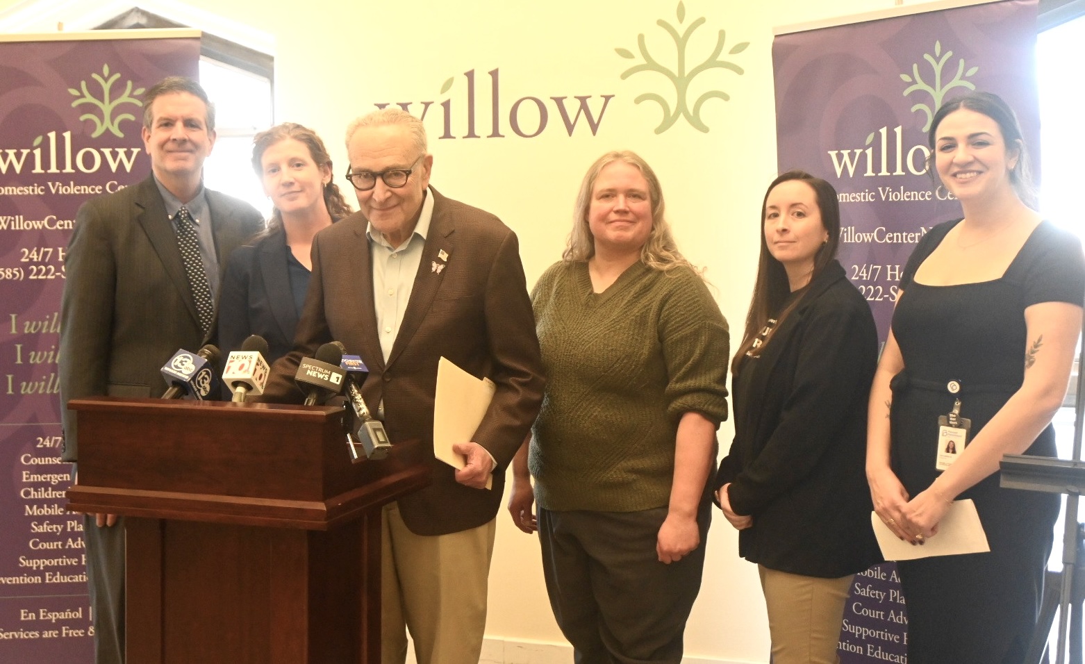 Photo from Schumer’s Office: U.S. Senate Minority Leader Charles Schumer speaks on Monday at a news conference at the Willow Domestic Violence Center. That center said there were more than 4,500 reports of domestic violence made in Monroe County in 2023.