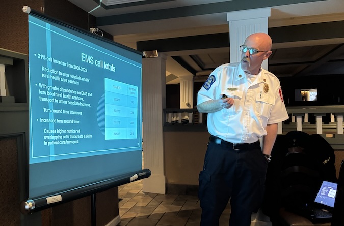 Photos by Tom Rivers: Medina Fire Chief Steve Cooley shows a slide detailing a 21 percent in ambulance calls for the Medina Fire Department from 2008 to 2025. He also provided an overview of a 90-page report from the New York State Rural Ambulance Services Task Force. Cooley spoke during Tuesday’s meeting of the Orleans County Association of Municipalities at the Fair Haven Inn. About 25 attended the meeting.
