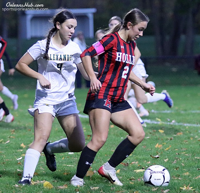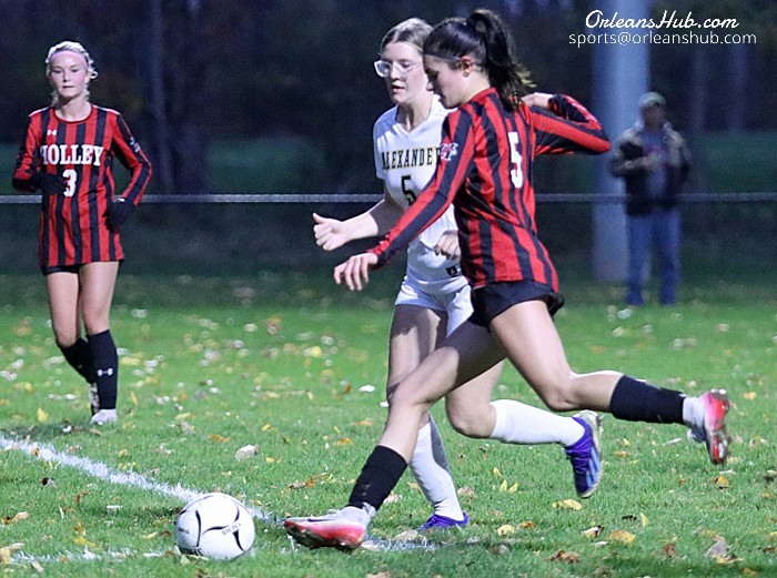 Photos by Cheryl Wertman – Holley’s Ava Mosier takes a shot to score her second goal of the opening half during the Lady Hawks sectional win over visiting Alexander this evening.