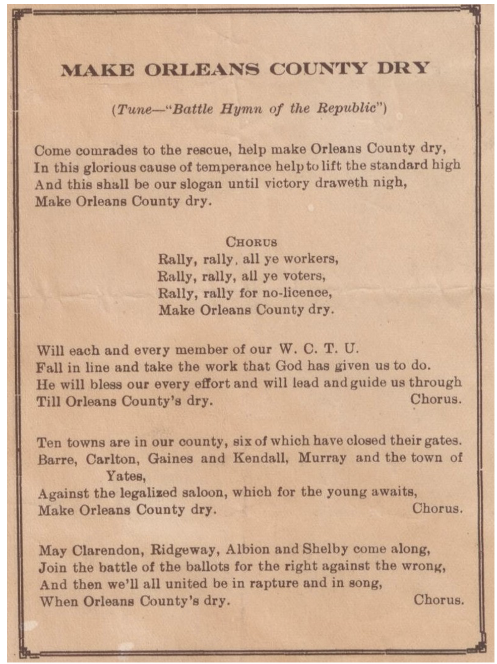 This song, “Make Orleans County Dry,” was discovered in notebook from the pages of a birthday book for the W.C.T.U. in Gaines.