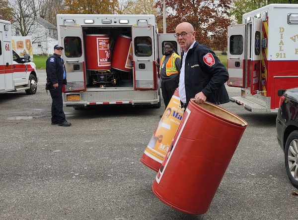 Medina Fire Chief Steve Cooley helps load red barrels in his department’s emergency vehicles to kick off the 2025 Christmas Present (Red Barrel) drive.