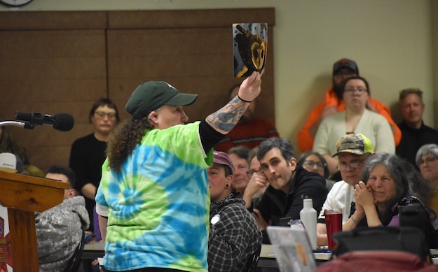 Photos by Tom Rivers: Chief Scott Logan, chief for the Bear Clan of the Tonawanda Seneca Nation, said the data center and development at STAMP, are a threat to Tonawanda culture and so much wildlife. He spoke during a public hearing on Thursday at the Alabama fire hall about $1.4 billion in incentives for the data center. He is holding a wampum belt that he said symbolizes peace between the United States and six nations of the Haudenosaunee. The belt shows how two different culture should be living as neighbors, with the Haudenosaunee not facing the potential loss of its traditions.
