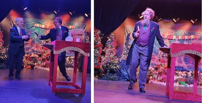 Photos by Ginny Kropf: (Left) Retired TV personality Mike Randall, right, and Medina Theater owner Joe Cardone draw winning tickets for free prizes following Randall’s presentation of Charles Dickens’ A Christmas Carol on Friday night at the Medina Theater. (Right) Mike Randall portrayed the roles of characters from A Christmas Carol. He performed to a full house Friday night at Medina Theater.