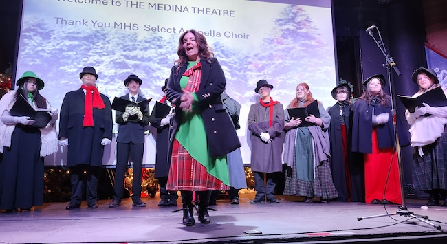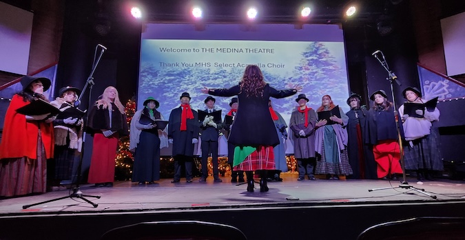 Rachel Trillizio, director of Medina High School’s A’Capella Choir, tells the audience at the Medina Theater how happy they are to sing for the community. The Select Choir entertained Friday night prior to Mike Randall’s performance of A Christmas Carol, which benefited food pantries and MAAC in Medina.