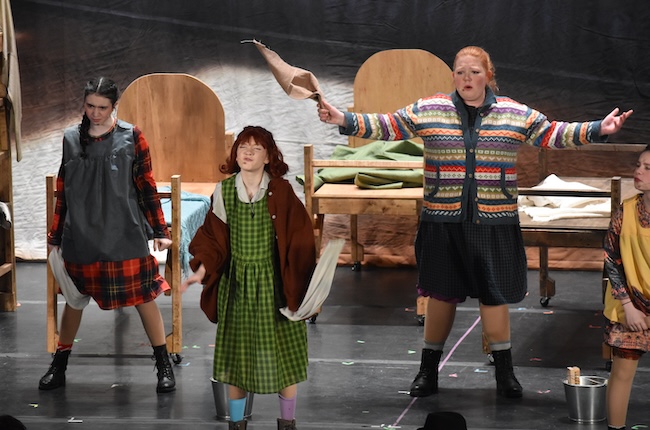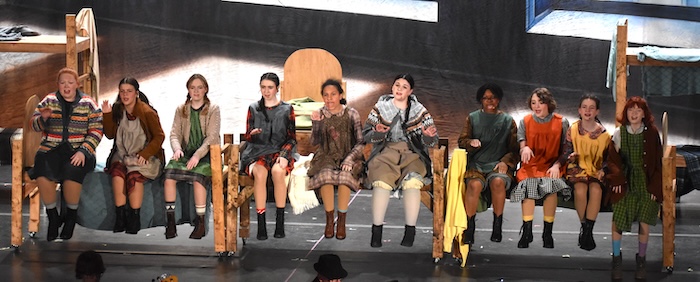 ALBION – Neveya Barnes plays the role of Annie, here singing “It’s the Hard Knock Life” with orphans Sophie Kozody (Maggie), left, and Olivia Andrews (July).