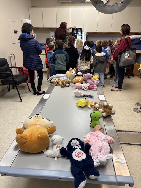 The kindergartners left their stuffed animals on the X-Ray table. Chutko showed students how that table goes up and down at the flip of a switch.