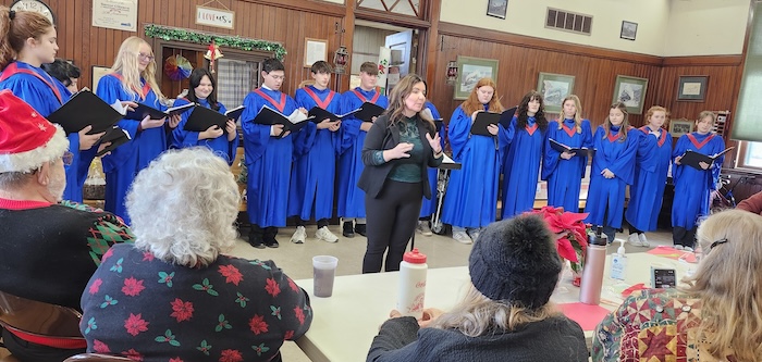 Rachel Trillizio, director of Medina High School’s A’Capella Choir, greets guests and introduces the choir at the annual Medina Senior Center Christmas dinner. The choir has been entertaining there for decades.