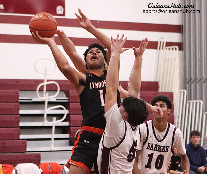 Lyndonville’s Quincy McClinsey tries for a layup as Carter DerSarkissian defends for Barker.