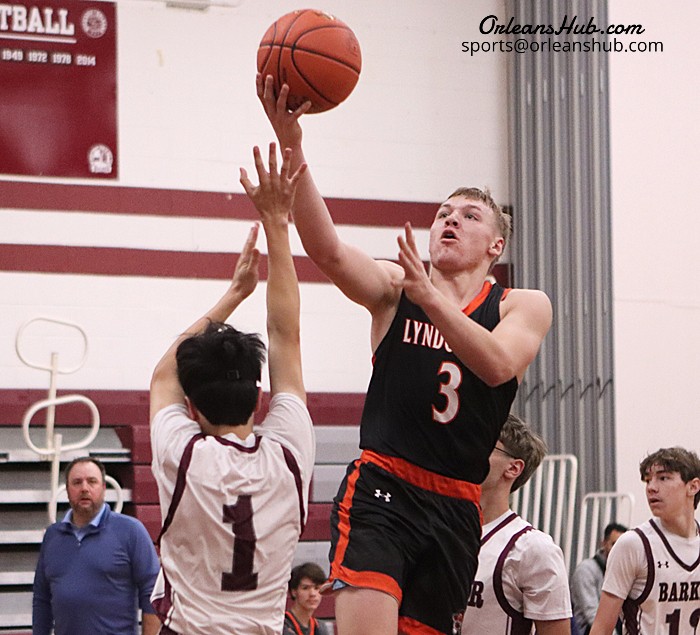 Lyndonville’s Lane Woodworth goes in for a layup as Caden Garcia defends for Barker.
