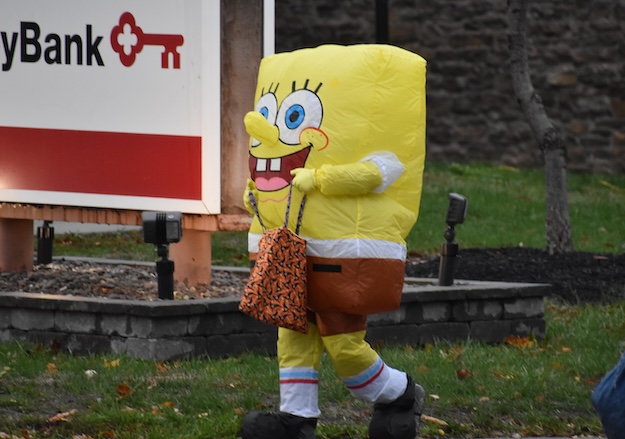 The top photo shows a kid dressed as SpongeBob SquarePants. SpongeBob is on the hunt for candy along Main Street in front of KeyBank.