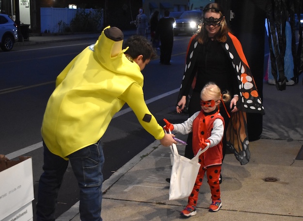 Micheal Fuller, co-owner of The Print Shop, hands out boxes of candy and stickers. Print Shop went through 800 in the first hour and had 1,000 ready to give away. Nicole Keith is the butterfly and her daughter Aurora is Miraculous Ladybug.