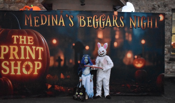 The Print Shop upped its efforts during Beggar’s Night in medina, creating this banner as a photo back drop. A long line waited outside at the Print Shop’s parking lot.