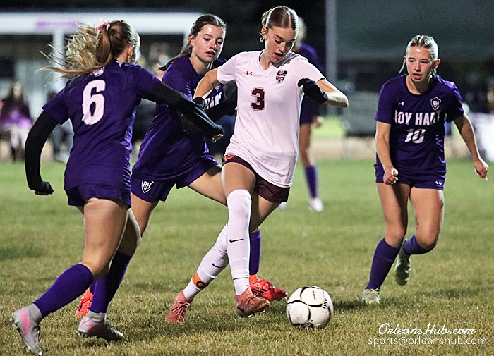 Barker/Lyndonville’s Alexa Robinson drives between Roy-Hart defenders Felicity Kwaizer, Josephine Silsby and Peyton Johengen.