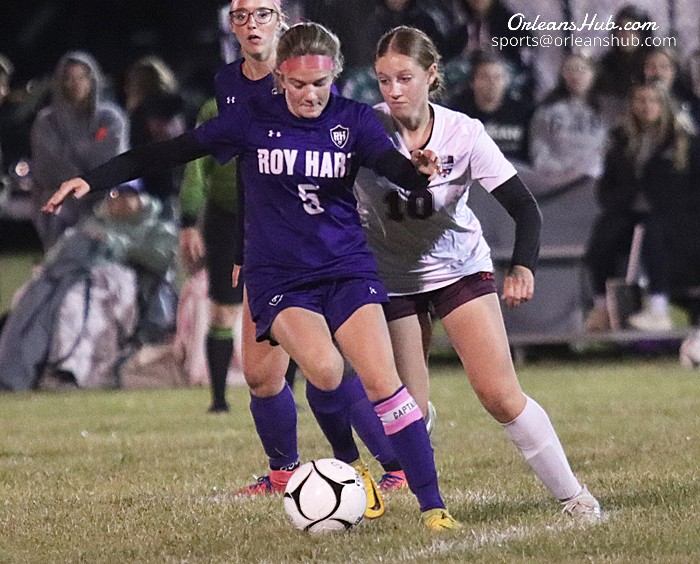 Photos by Cheryl Wertman – Roy-Hart’s Maria Trombley works to keep the ball away from Barker/Lyndonville’s Braelynn Dillenbeck during the Lady Rams home field win this evening.