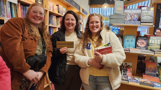 Ashley Harnish of North Tonawanda, center, holds the Golden Ticket she found hidden at Author’s Note, during Independent Bookstore Day on Saturday. The prize earned her 12 free audio books. With her, at left, are Amanda Tarsdale and Katie Edwards, right, both of Medina.