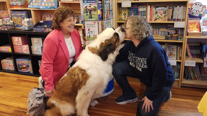 Author’s Note owner and best-selling author Julie Berry, kneels down to kiss Crush, the St. Bernard therapy dog owned by Wendi Pencille, left. Pencille signed copies of her first book, Crush Finds His Place, during Independent Bookstore Day.