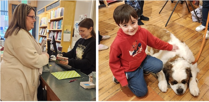 (Left) Chrissy Bloom of Albion buys books for her kids during Independent Bookstore Day Saturday at Author’s Note. (Right) Scott Robinson of Medina brought son Roux to Author’s Note on Saturday to meet Crush, the therapy dog, whose owner/trainer Wendi Pencille has written a book about him.